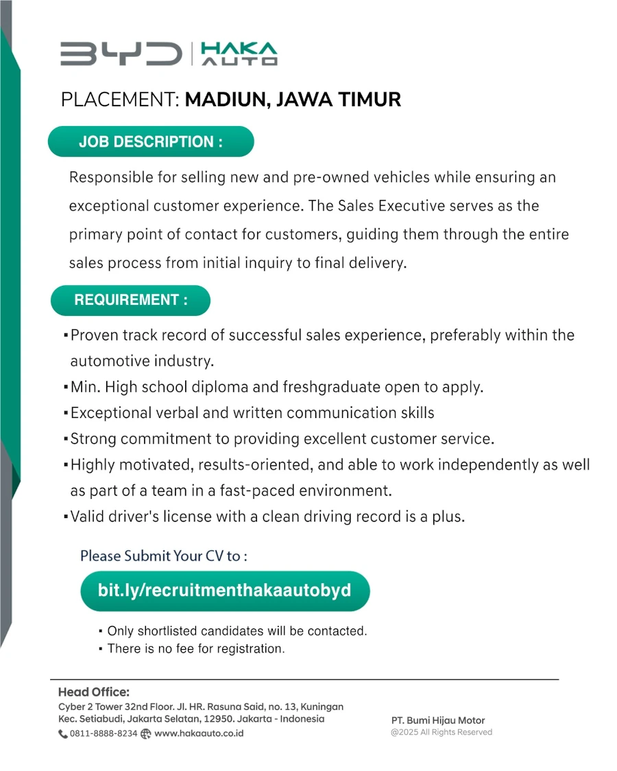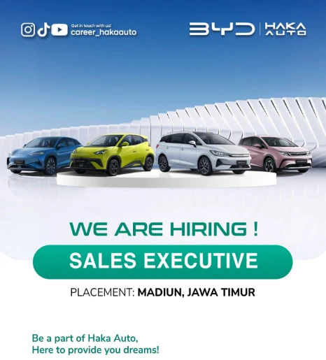 Job Vacancies – BYD Haka Auto October 30, 2025 Job Vacancies – BYD Haka Auto We are opening opportunities for the best professionals to join BYD Haka Auto in the following positions: Sales Executive Location: Madiun, Jawa Timur Be a part of Haka Auto, Here to provide your dreams